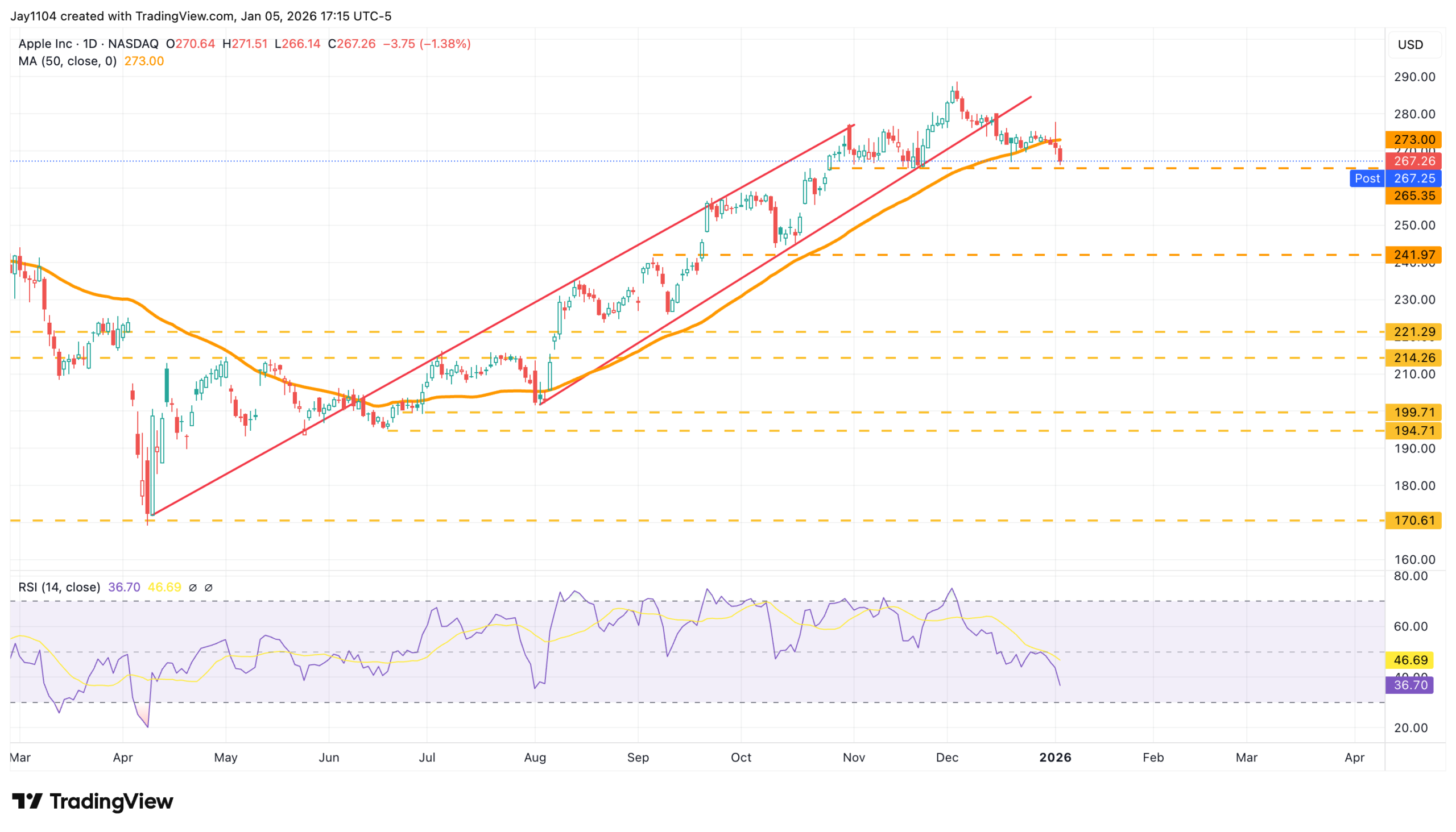 The problem, of course, is that Apple shares fell by more than 1% today and dropped below their 50-day moving average for the first time since July. The technical damage could worsen if the stock breaks below the $265 support level.
