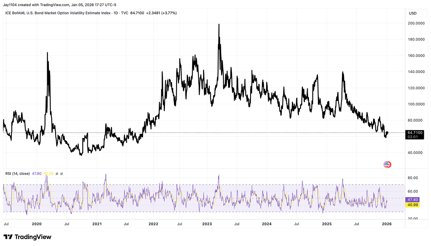 Bond market implied volatility rose today, with the MOVE index climbing to 64.7, and, like equity market volatility, bond market volatility is also really low, especially given the events coming up on the calendar.