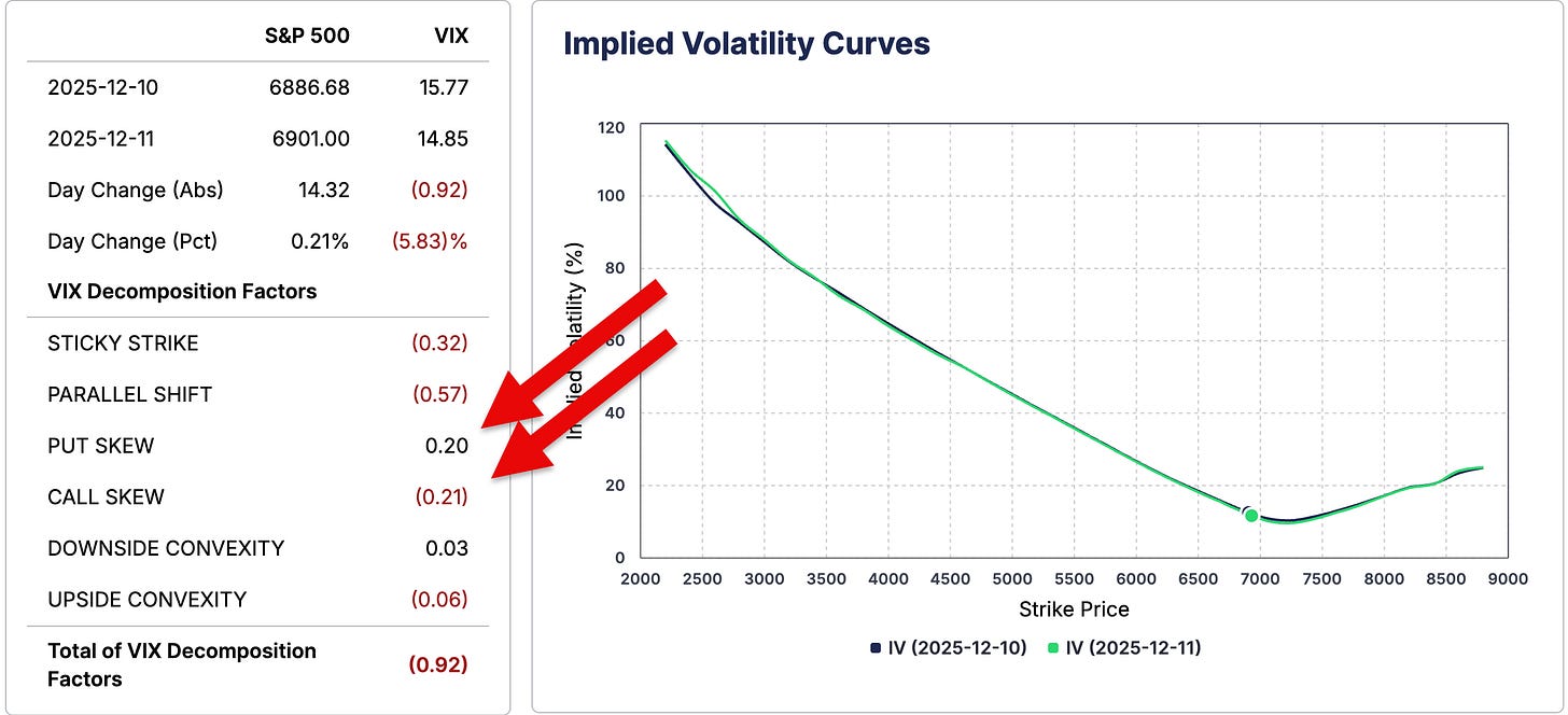 What is perhaps most interesting about today is that the VIX decomposition shows call skew falling while put skew rose. That combination suggests that ATM put implied volatility fell faster than OTM put implied volatility within the VIX index, which is not what you would normally expect to see on a day like today. Under more typical circumstances, volatility would be crushed across puts as hedges are closed. Instead, today’s action suggests that near-money puts were closed out—likely during the morning selloff—while OTM and longer-dated downside protection remained elevated.