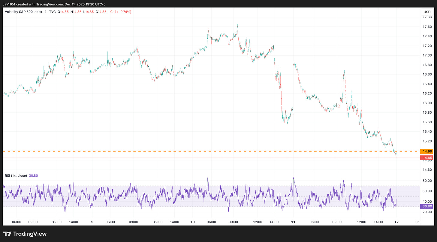 That said, today followed a fairly classic pattern. The VIX traded overnight around 17, opened the cash session around 16 and then declined steadily to close near 15. A move like that typically reflects one of two dynamics: traders closing out put positions or traders selling calls.