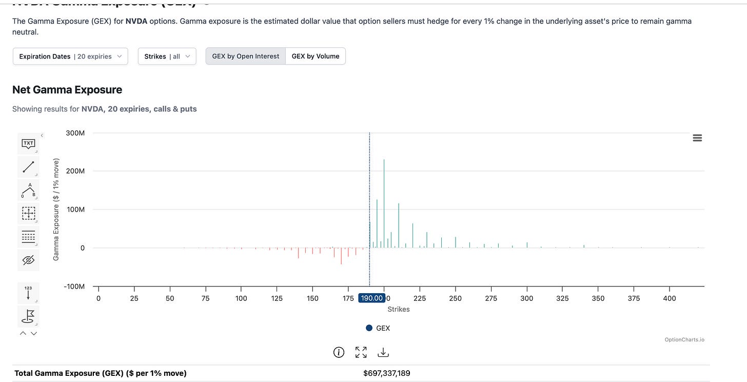 $195–$200 Resistance Is the Critical Hurdle: The options market shows massive gamma concentration at the $195 and $200 strike prices, meaning NVIDIA likely needs a blowout earnings surprise — well beyond the typical beat-and-raise — to push through $200 and sustain upside momentum.