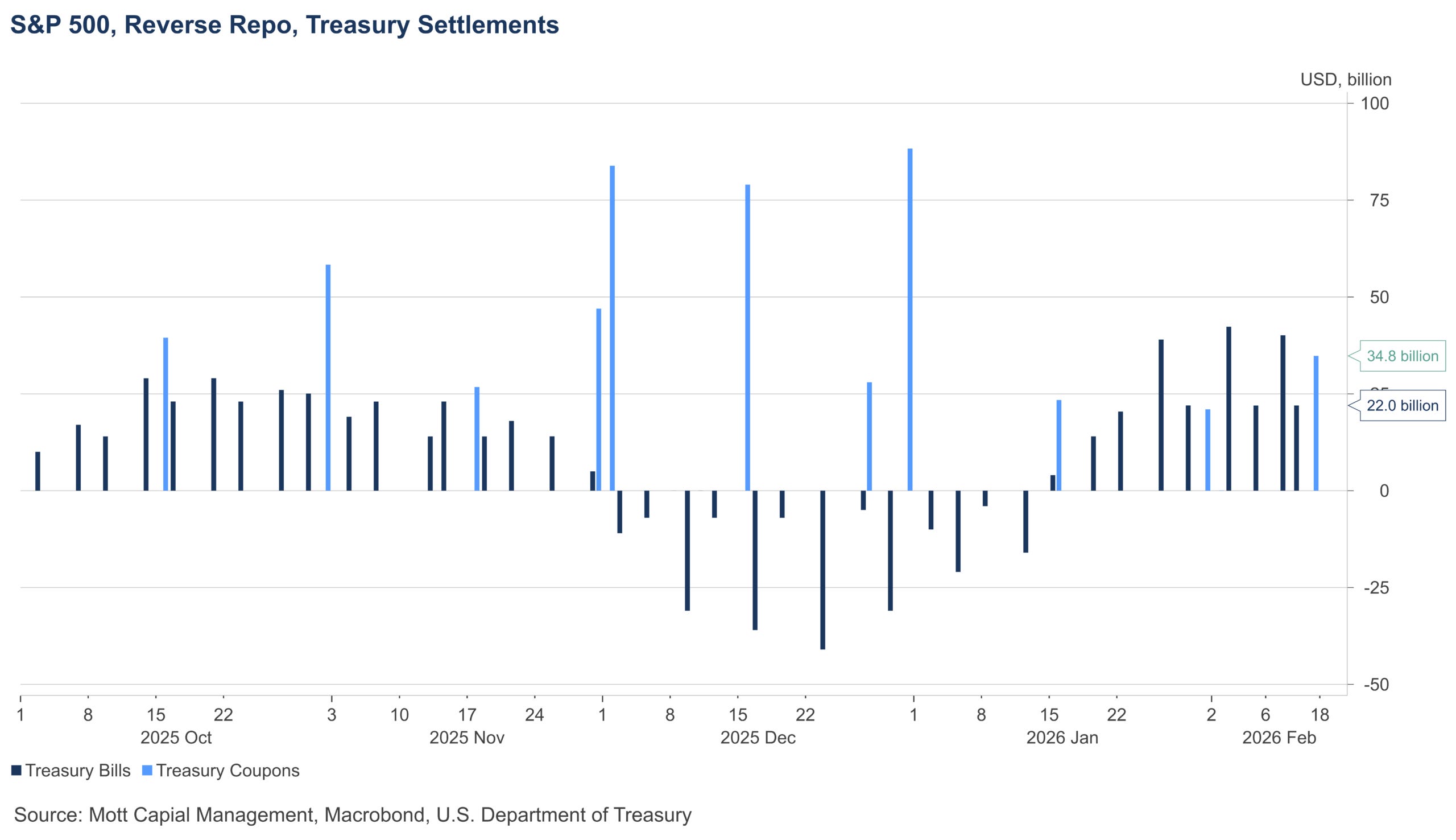 Liquidity drains will continue this week as the Treasury settles another $62 billion in T-bills. That will continue on February 17, when it settles about $35 billion in coupons, meaning over the next week, about $90 billion will need to be raised for settlement. The bill schedule for the week of February 17 could add another $60 billion to that total. This means that, over the next two weeks, we could be looking at $150 billion in settlements. However, we won’t have full details until later this week.