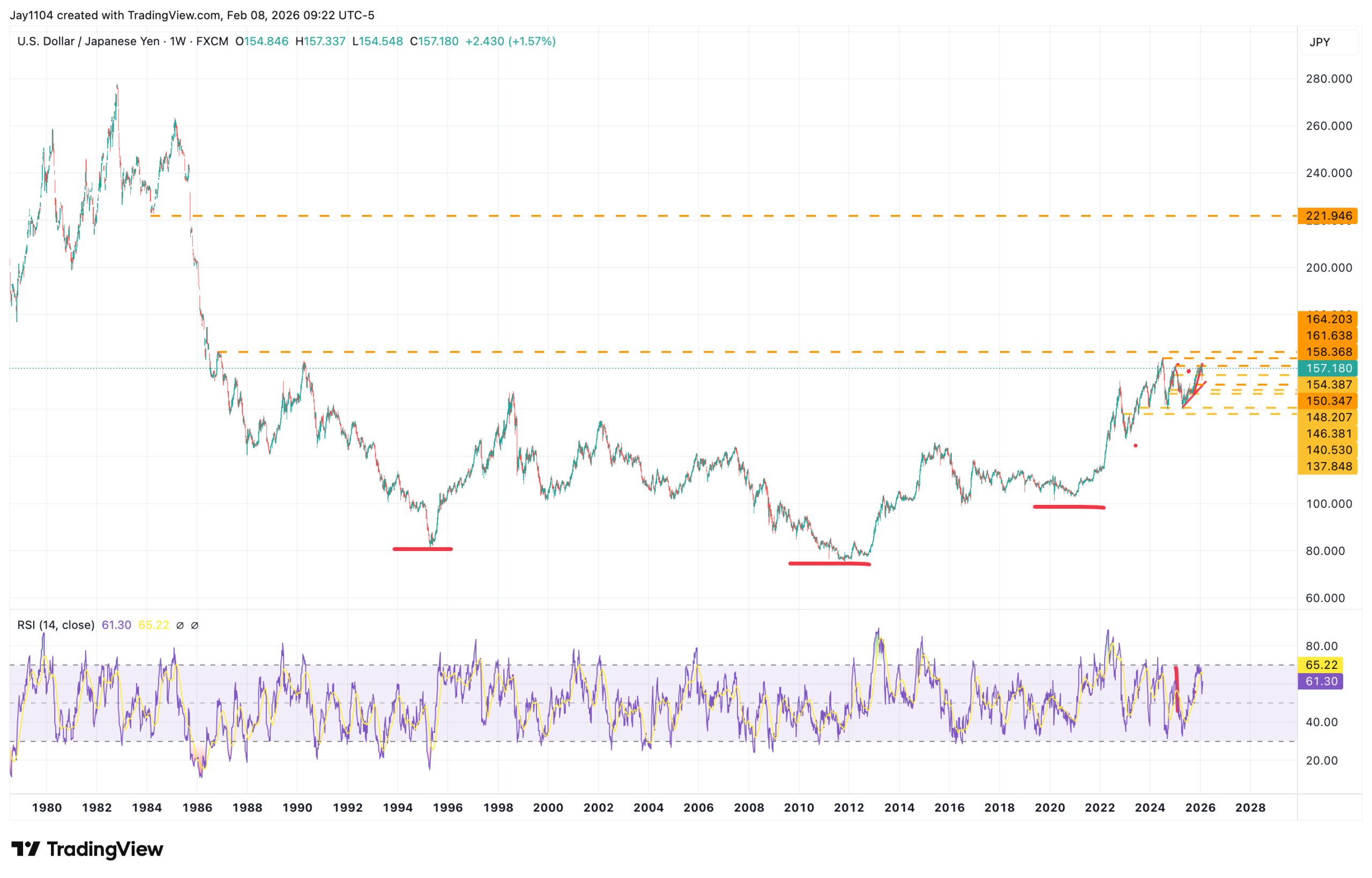 A weekly technical chart of the USD/JPY shows why. After 160, the next level of resistance comes around 164, and that is it, because it would seem to me that 220 comes next. It certainly sounds crazy, but then again, talk of the 10-year JGB trading over 2% sounded that way a year ago, too.