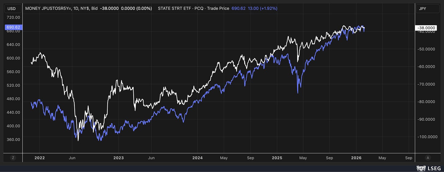 We tend to care about this only because of the impact we have seen on our own market, specifically on the direction of the 5-year cross-currency basis swap and SPY. That trend has not broken for nearly 4 years now. Right now, based on this chart, dollar funding conditions are easy, which is probably part of the reason why we have seen assets like Bitcoin and certain parts of the equity market get smashed while the broader index holds together.