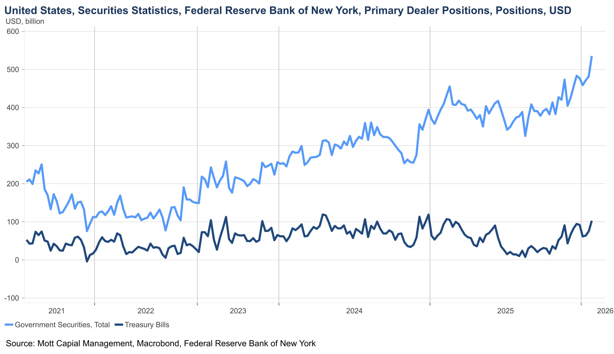 Dealer Balance Sheets: The inventory of securities and associated liabilities held by primary dealers. When dealers absorb more Treasury supply, it can crowd out their capacity to provide liquidity elsewhere in the market.